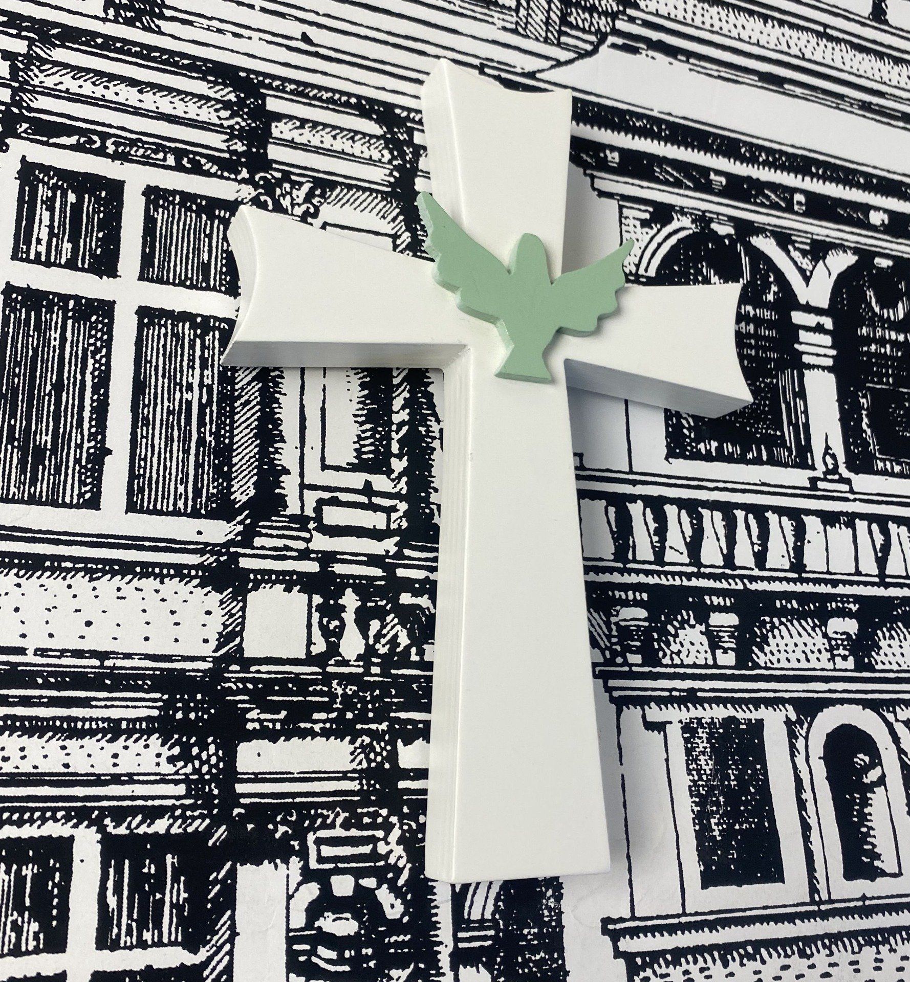 Croix en bois blanche avec colombe vert tilleul.