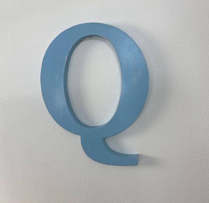 La lettre Q en première photo est réalisée en couleur bleu ciel n°34 du nuancier avec une patine légère.