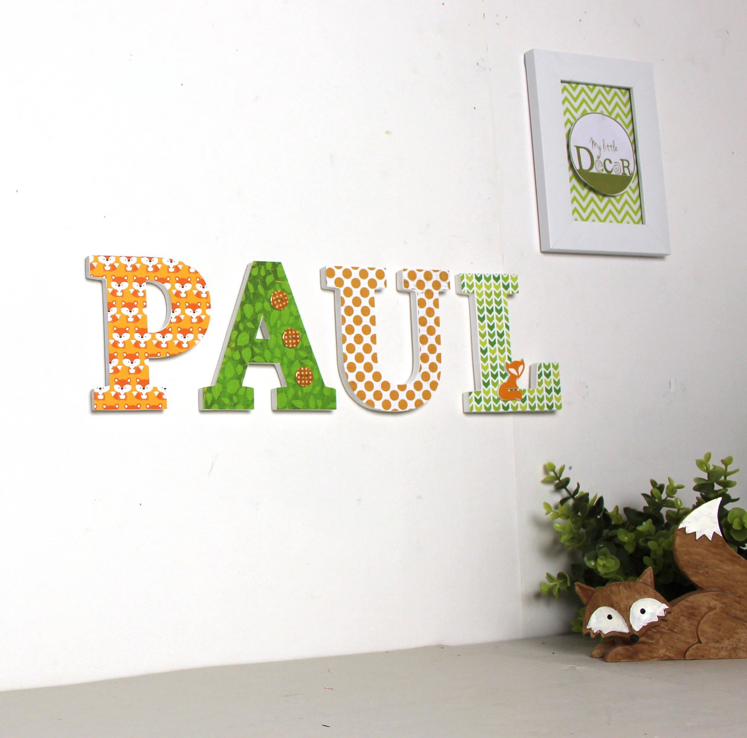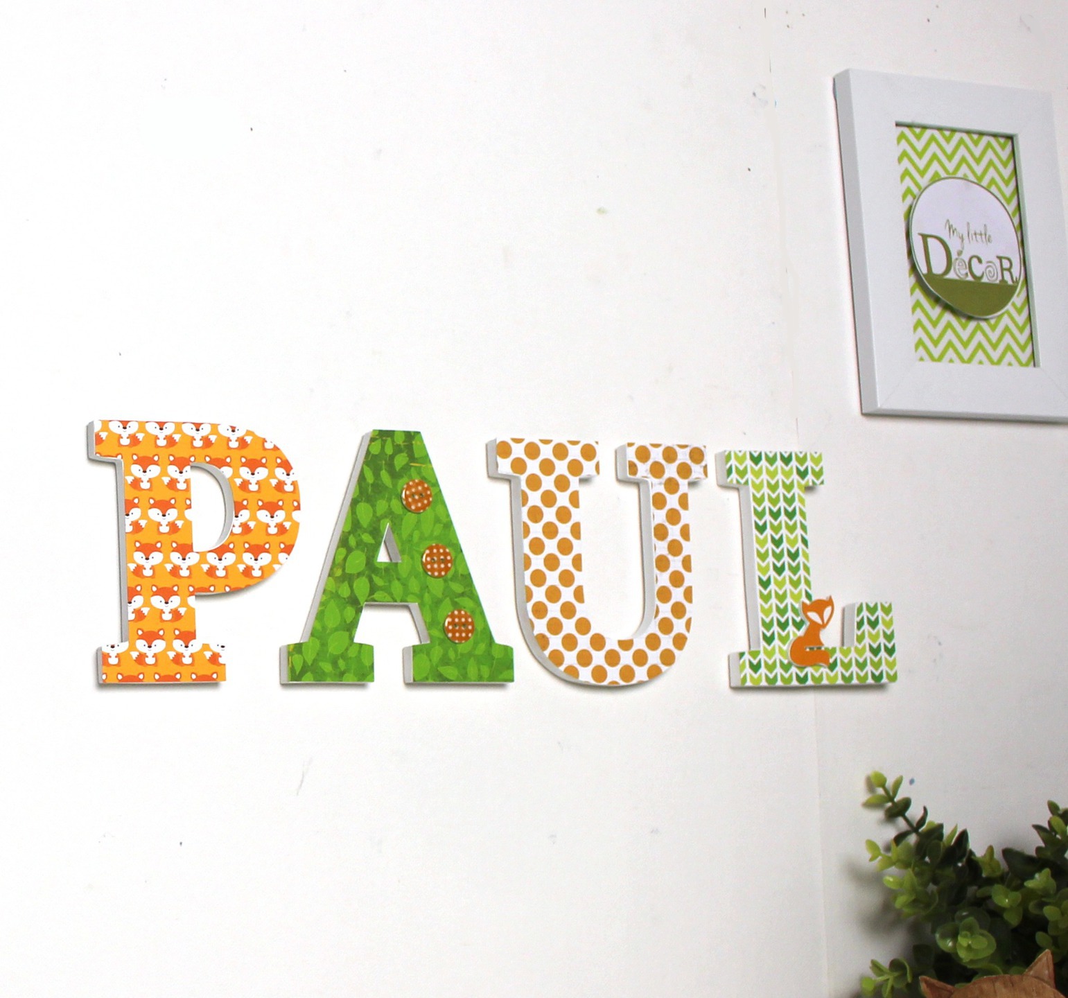 Lettres en bois Paul orange vert - prénom personnalisé - renard - lettres décoratives- mylittledecor