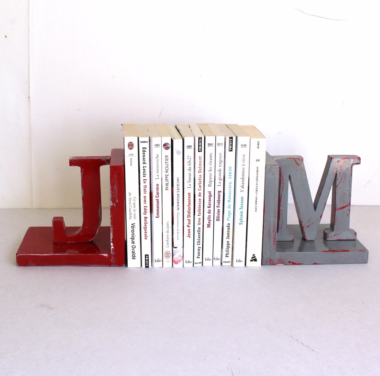 Lot de 2 serre-livres en bois personnalisés rouge et gris.