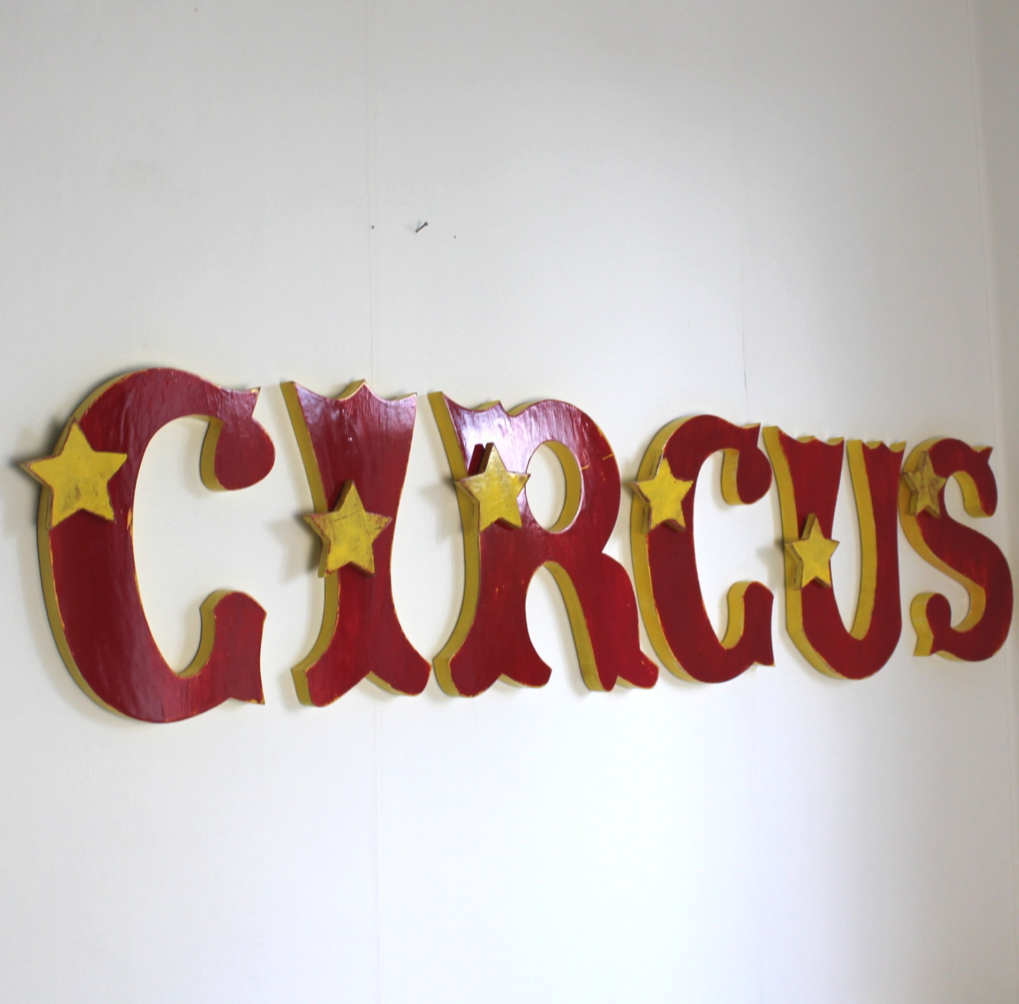 Voici un grand élèment de décoration : un mot en bois "CIRCUS" rouge et jaune.